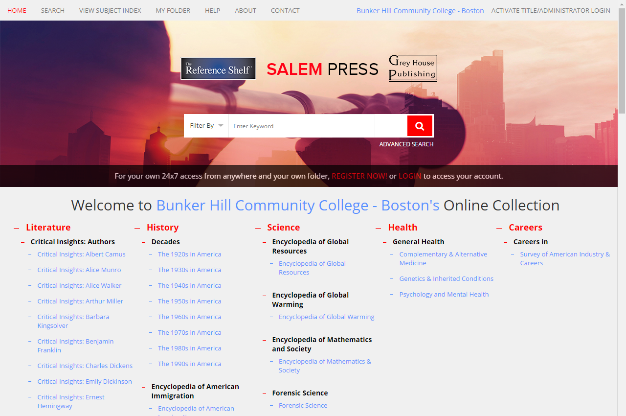 The Salem Press eBook collection provides access to multiple reference titles covering health, science, literature, and history. Salem Press eBooks are accessible through website connection only.