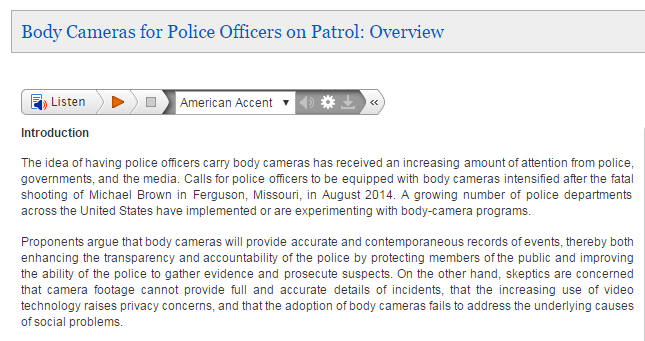 Tsin Yen, Koh. "Body Cameras For Police Officers On Patrol: Overview." Points Of View: Body Cameras For Police Officers On Patrol (2016): 1. Points of View Reference Center. Web. 17 Mar. 2016.